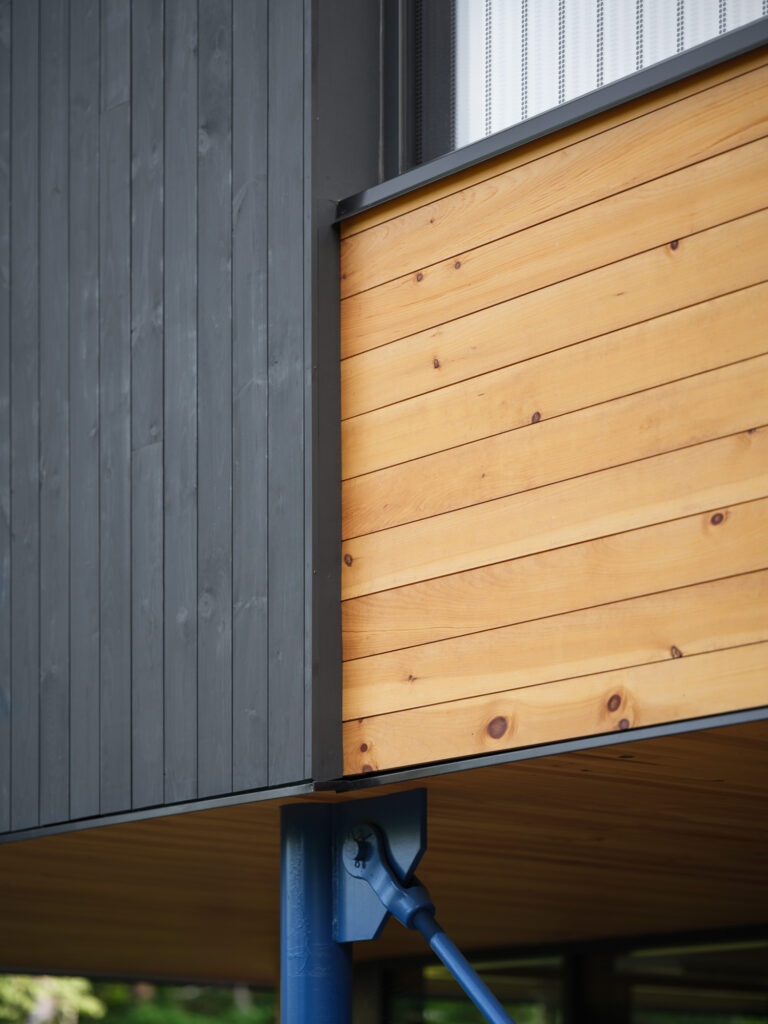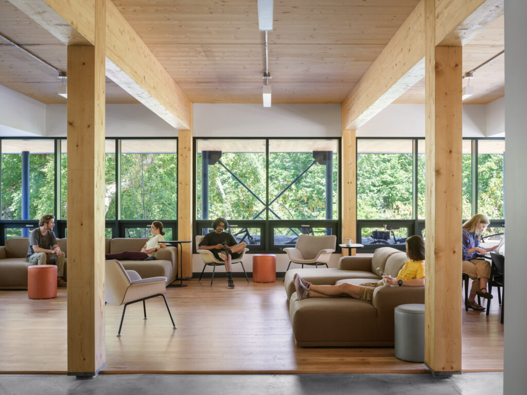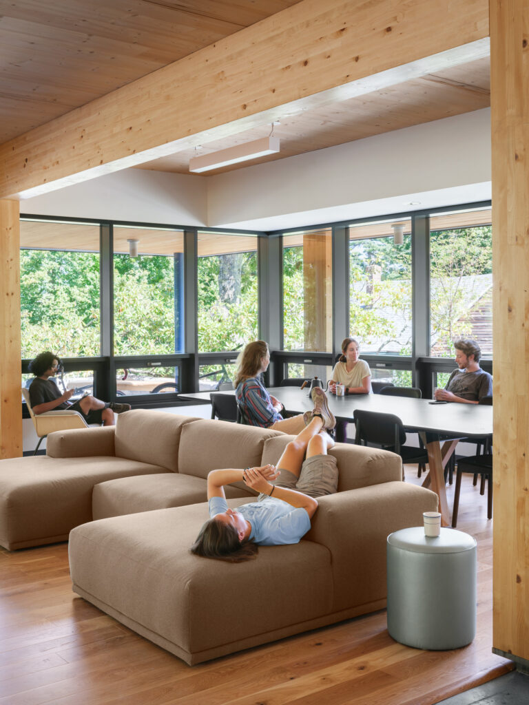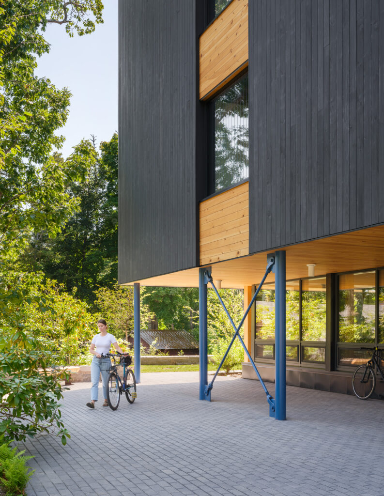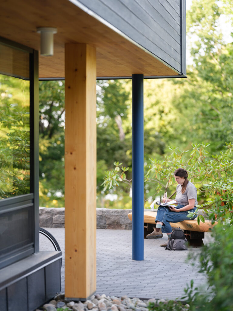 Iterating on OPAL’s previously designed Davis Center for Human Ecology, the design team selected an all-mass timber structure, paired with wood infill walls, and wood fiber insulation; an all-wood assembly, sequestering biogenic carbon, at Passive House level energy performance; one of the first of its kind. The building is set to be net-zero in energy usage, and is designed with an unwavering approach to maximize total decarbonization across all assemblies and systems. Further, the design locates the building on a previously developed site, limiting ecosystem impact, and utilizes bird-safe glazing throughout, to reinforce local habitat.