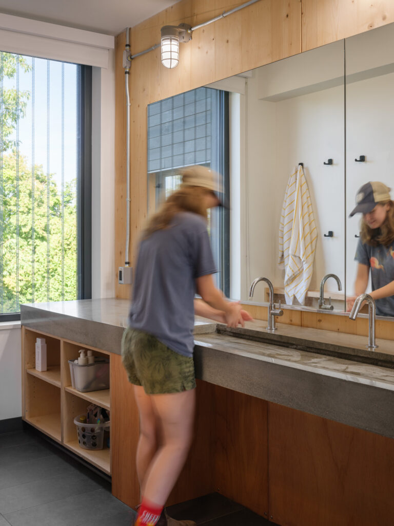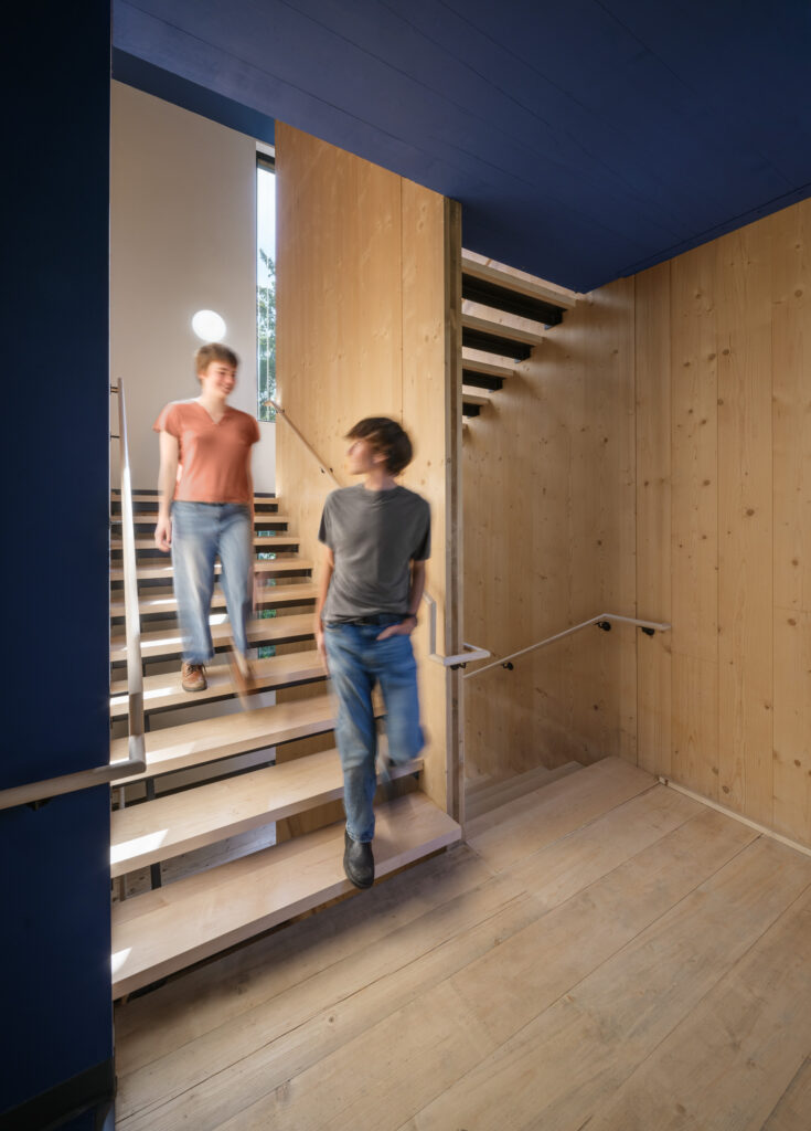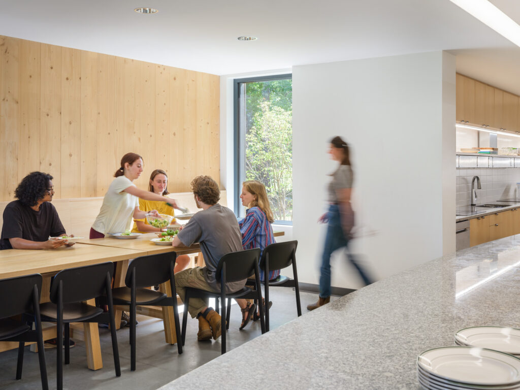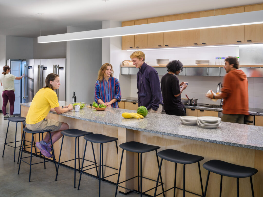 The design seeks to maximize the scale and connectivity of the first-floor kitchen and meeting spaces, consistent with the college’s emphasis on reinforcing community. The communal kitchen is designed to allow for both large and small groups to cook together, with ample area to convene and eat, along with personalized, connected storage for every student. The sleeping rooms themselves are a mix of single and double occupancy, all with exposed structure on the walls and ceilings, highlighting the beauty, and simplicity, of the unique structural system.