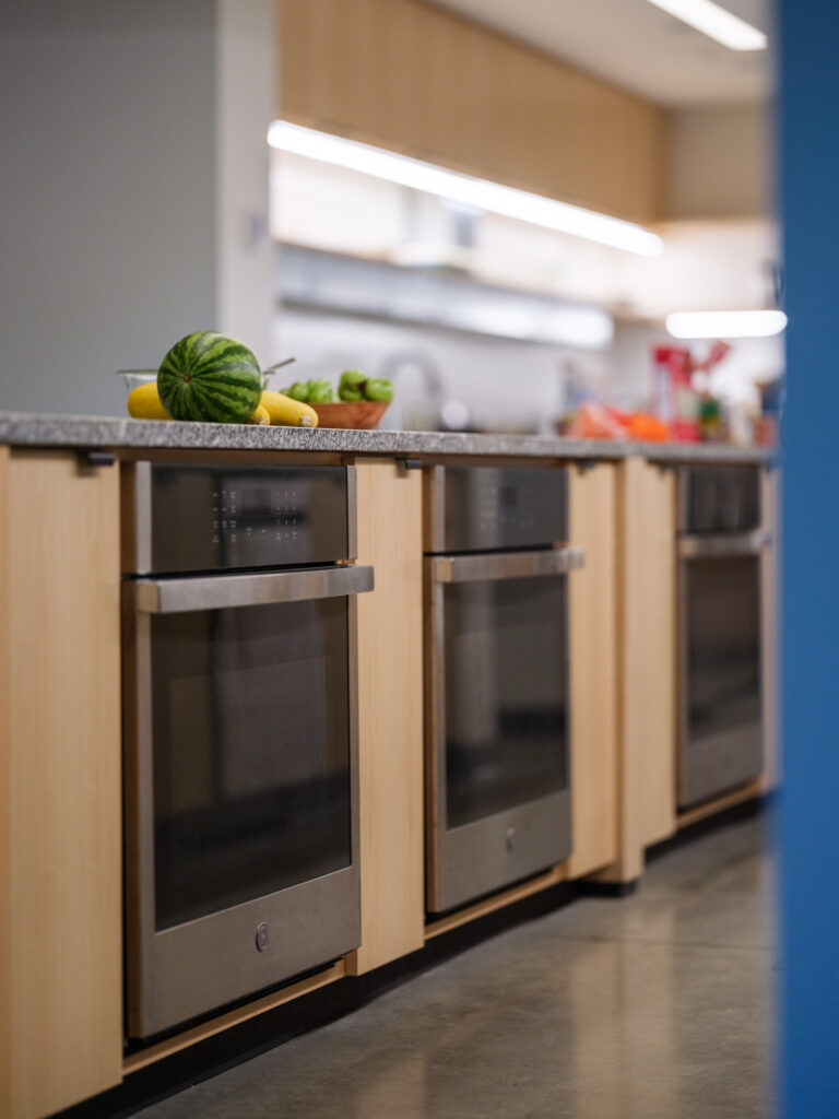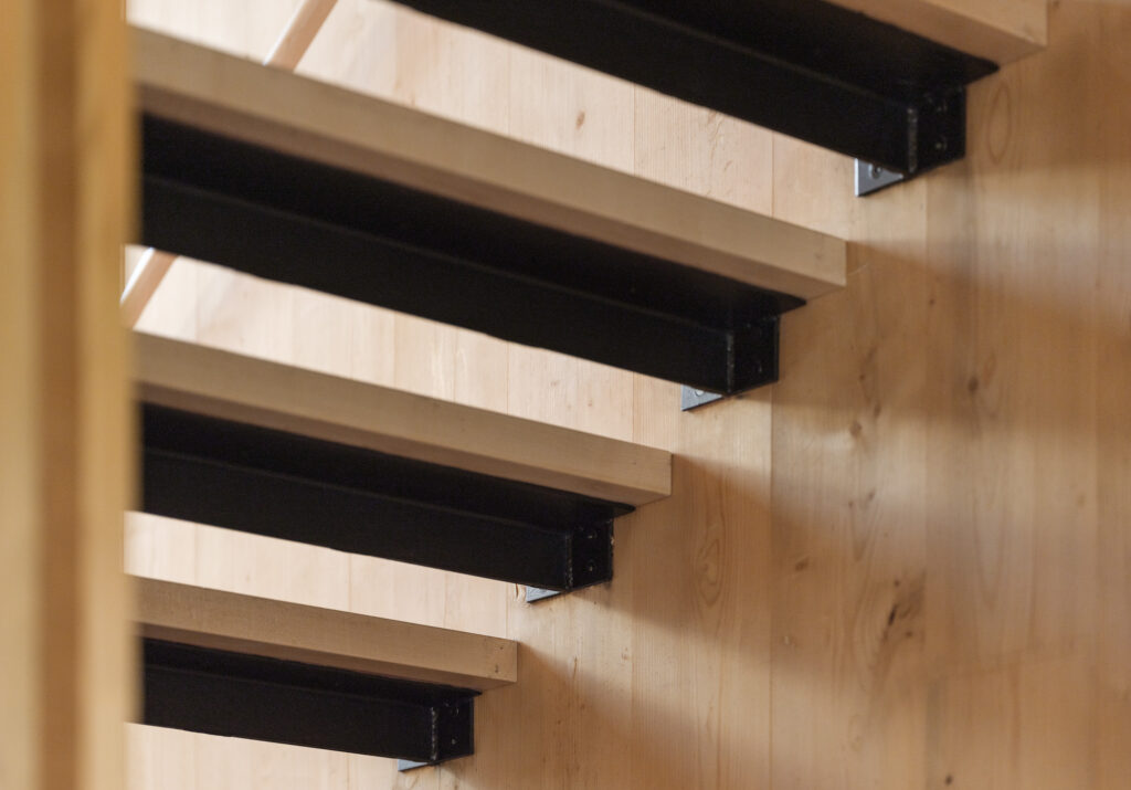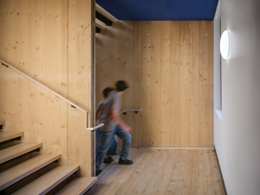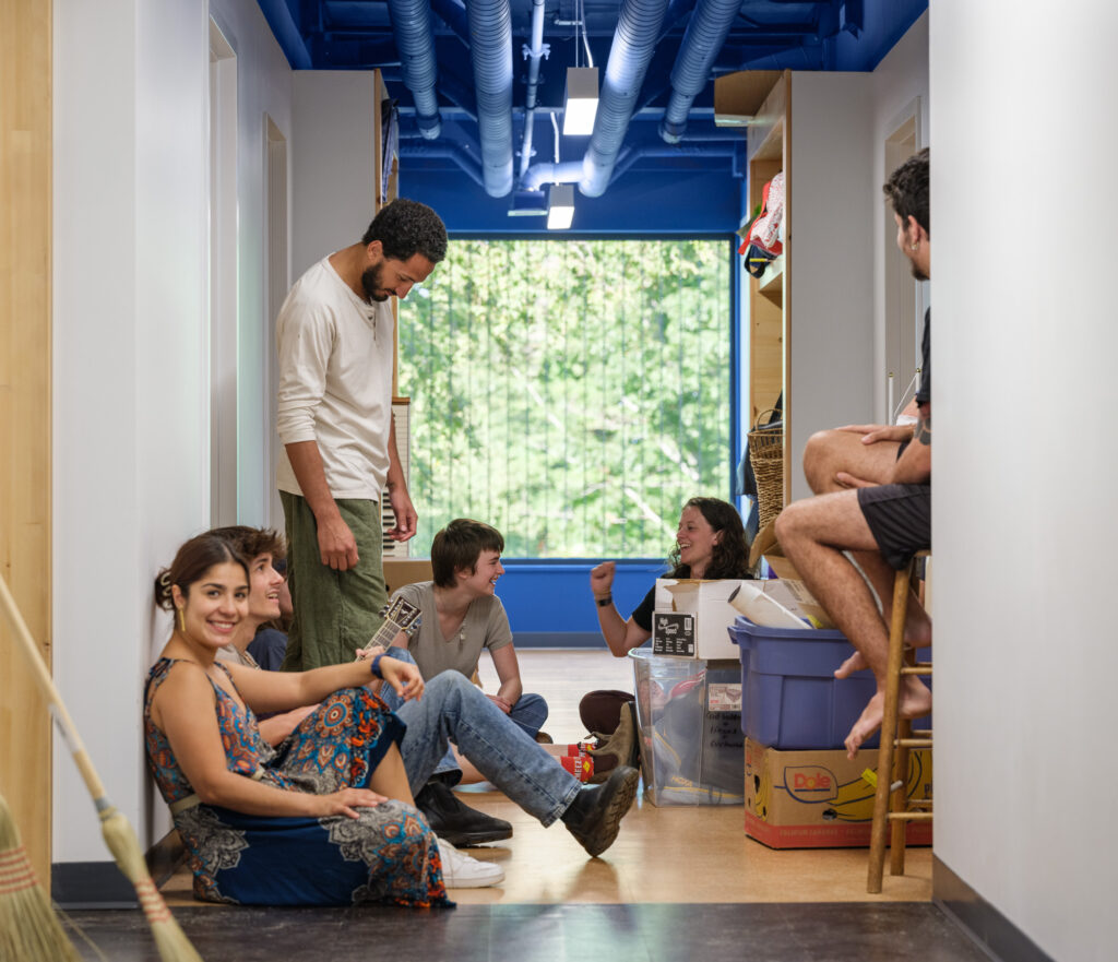 The design seeks to maximize the scale and connectivity of the first-floor kitchen and meeting spaces, consistent with the college’s emphasis on reinforcing community. The communal kitchen is designed to allow for both large and small groups to cook together, with ample area to convene and eat, along with personalized, connected storage for every student. The sleeping rooms themselves are a mix of single and double occupancy, all with exposed structure on the walls and ceilings, highlighting the beauty, and simplicity, of the unique structural system.